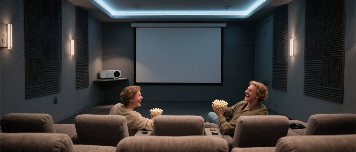 Ici, on entre dans du sérieux. Le vidéoprojecteur 4K devient la norme (1 500-5 000€), l’écran peut être motorisé (500-2 000€), et le système audio intègre souvent le Dolby Atmos (2 000-6 000€). Un début de traitement acoustique et quelques travaux d’isolation sont prévus. L’installation peut mélanger DIY et intervention ponctuelle de professionnels.